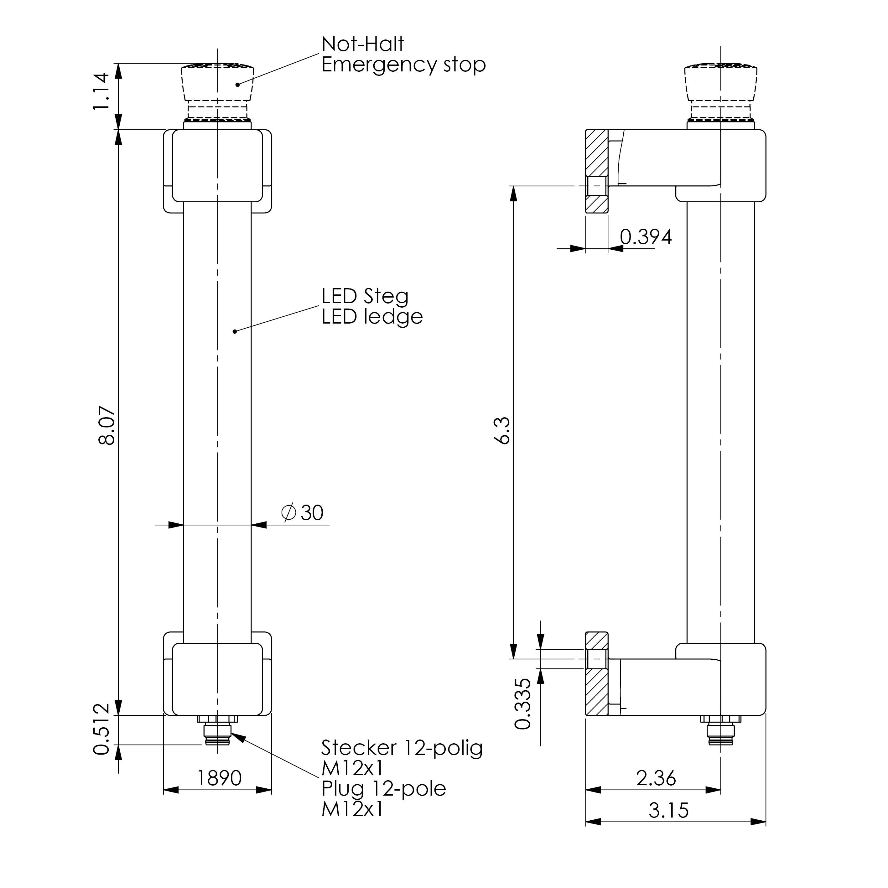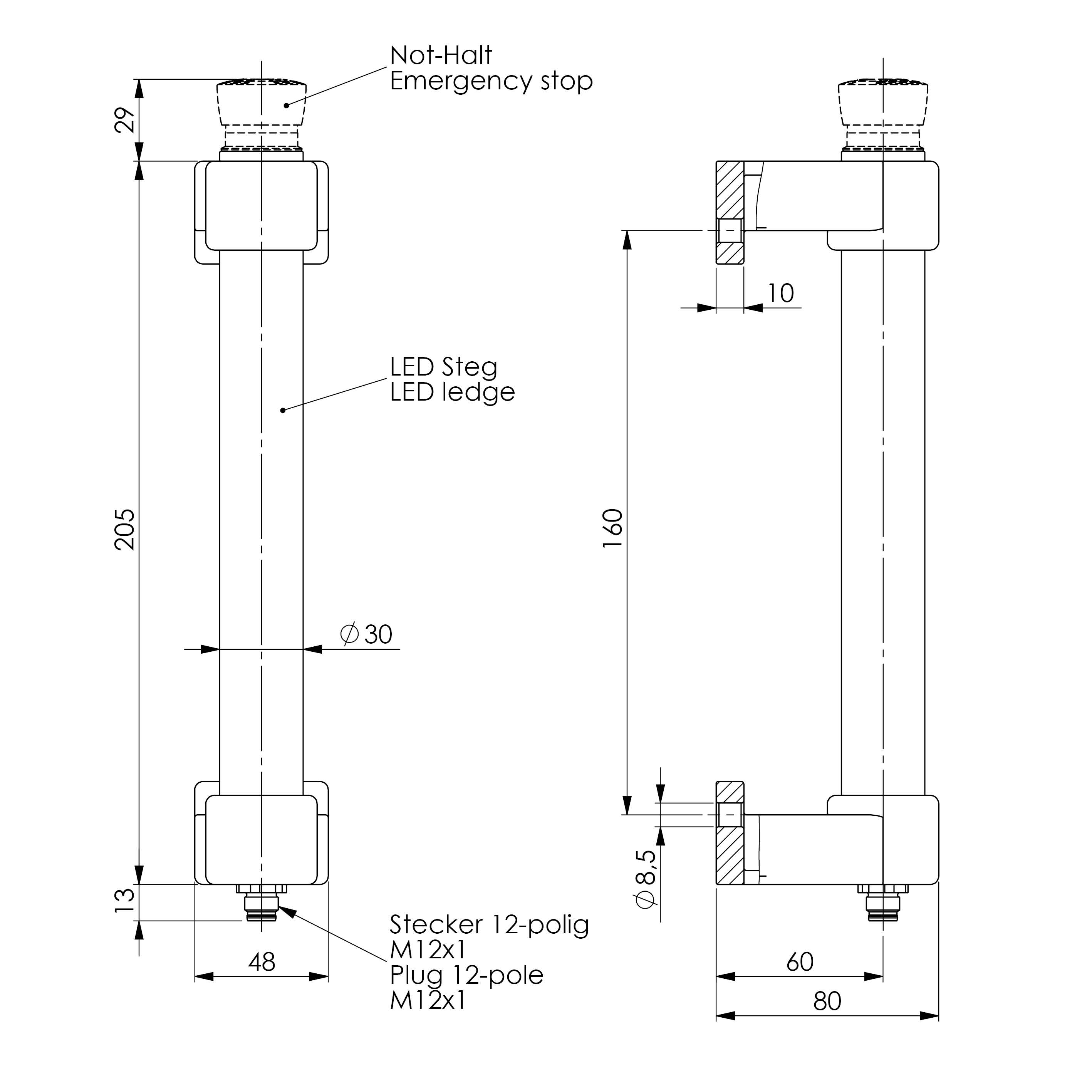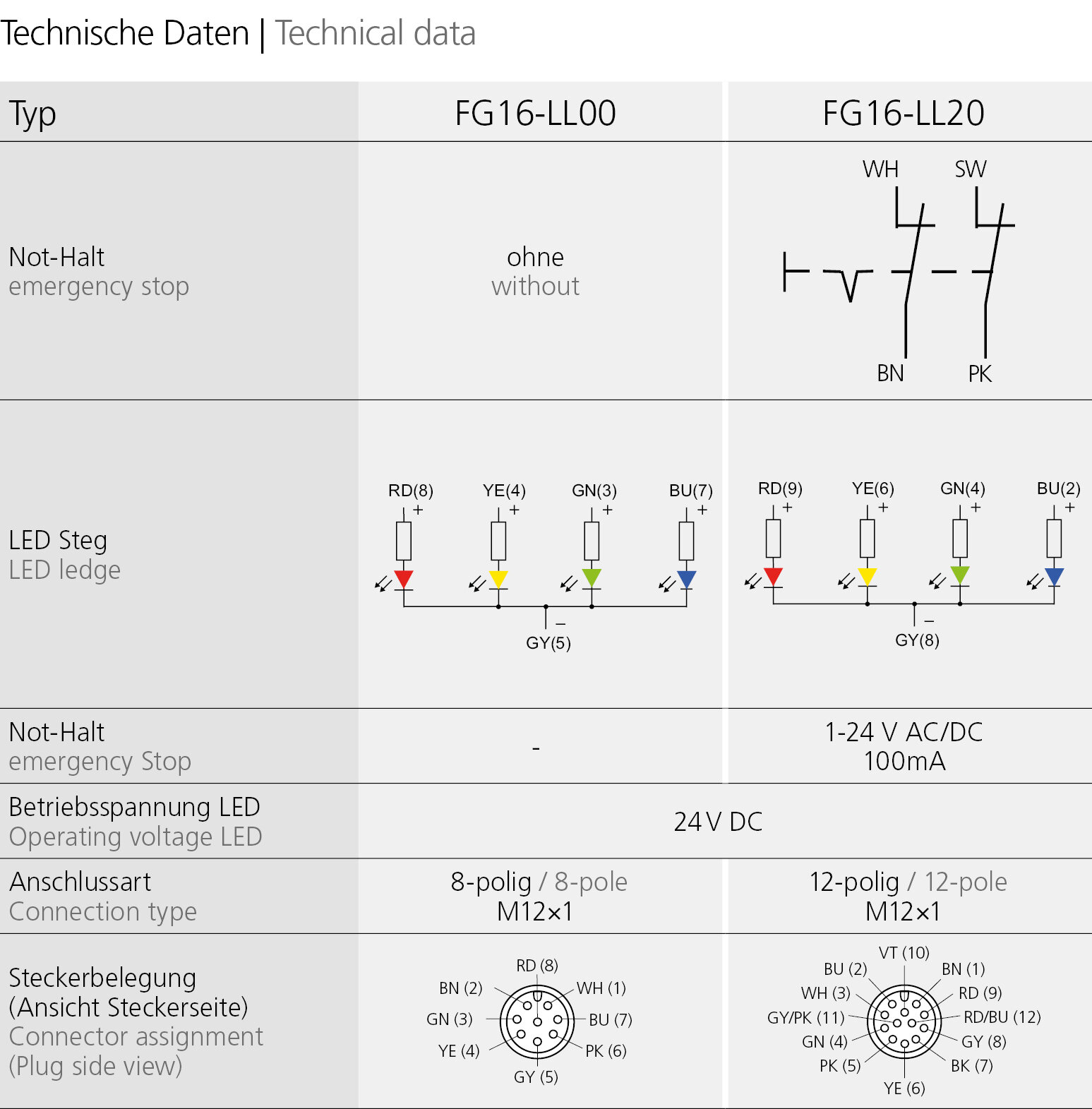 Not-Halt ud LED Steg mit LED rot, gelb, blau und grün.