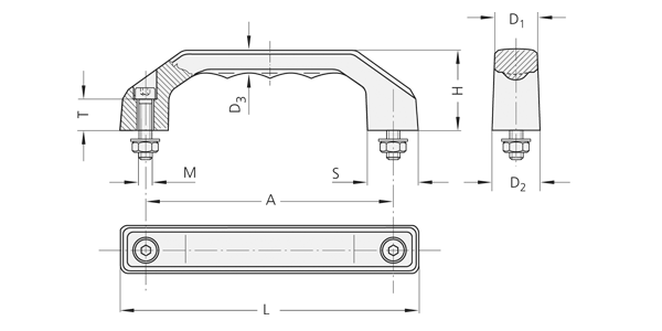Handle made of polyamid PA6, glass ball reinforced, black with fine structure.