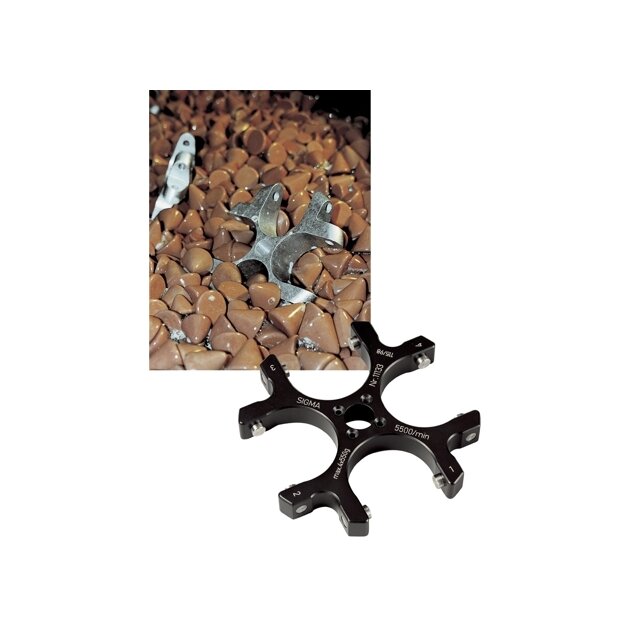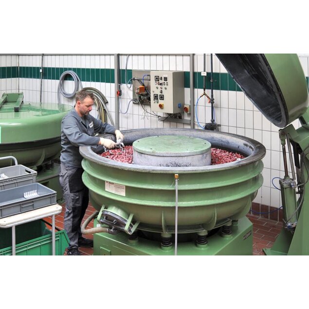 Here the parts to be processed move in spiral fashion in a mixture of abrasives and patented watery abrasive solutions in round machines (s. fig.) or rotate in vats (depending on the size). A large number of different abrasives offer a wide range of applications. The processing times vary here from approx. 1-8 hrs. or more depending on the requirement and material.