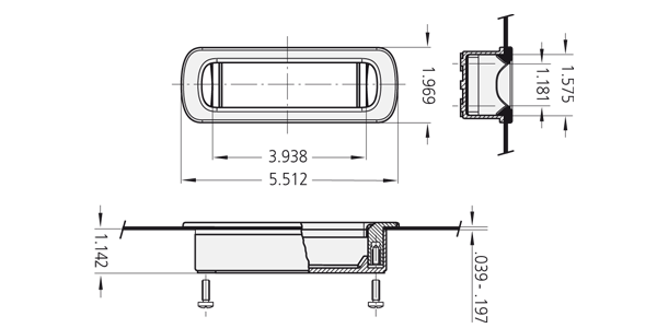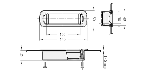 Montagem: Primeiro a peça da frente é inserida no recorte da parede. De seguida, do lado interior, a peça da traseira pode ser empurrada sobre a parte saliente da peça da frente. Depois, a pega é fixada por meio de quatro parafusos.