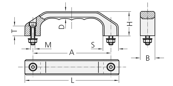 Tipo de puxador EG-1F incl. parafusos cilíndricos, tipo Allen, DIN 912, porcas DIN 934 e anilhas DIN 125.
