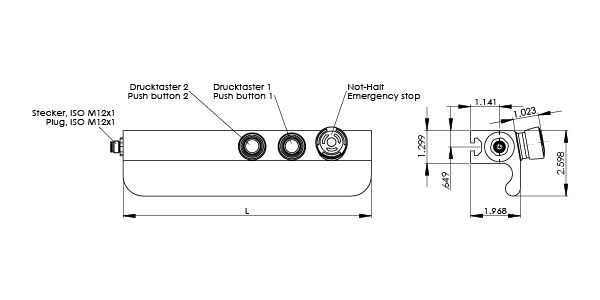 | 產品類型 TG2-05 | 描述 2个按钮和紧急停止 | L 250 | Version 左 | 商品編號 TG2-05.LA250.11 3D+CAD |