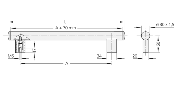 管子,ø30x1,5 mm 铝、铝镁硅合金 0.5 制成,经过精磨加工,天然色,经过阳极氧化处理, 或者黑色粉末冶金涂层,精细结构。可选择不锈钢,材料号 1.4301,经过精磨加工。聚酰胺 (PA6) 材质的管支架和管罩,玻璃纤维增强,黑色, 半光泽,精细结构。